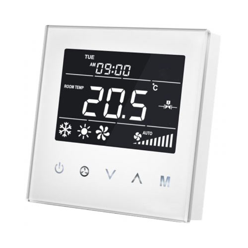Slimme thermostaat in wit voor bediening van een fancoil (lucht)verwarmingsunit waarmee je kunt verwarmen. Maak slanke verwarmingsschema's om de ruimte alleen te verwarmen als dat gewenst is.